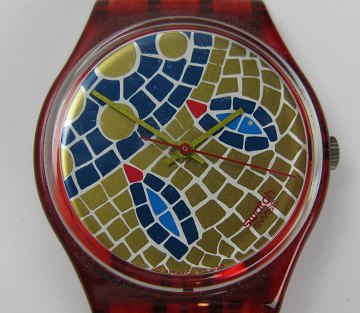 Nyt Swatch armbåndsur i urkasse og med rem af dekoreret plast, quartsværk, ref. nr. GN 131*