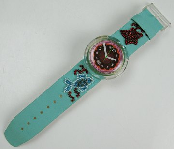 Nyt Swatch armbåndsur i urkasse af plast og med dekoreret læderrem, quartsværk, ref. nr.PWZ106. Soupe de poisson (Fiskesuppe) original emballage i form af kammusling i fiskenet samt certifikater medfølger.