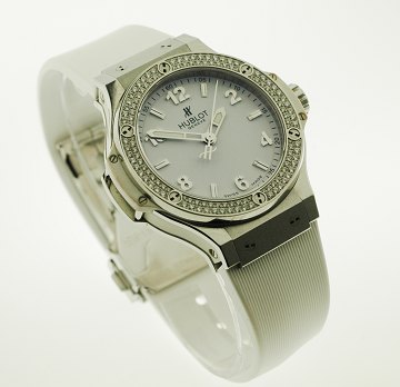 Hublot 361 SE Big Bang Unisex armbåndsur (St.Mortitz) i urkasse af stål, lynette prydet med 126 brillantslebne diamanter på samlet 0,87 ct. Skive med arabertal og stregindikation bag safirglas. Urkasse Diam. 38 mm. HUB 38 quartsværk. Hvid gummirem med blankpoleret stålspænde.