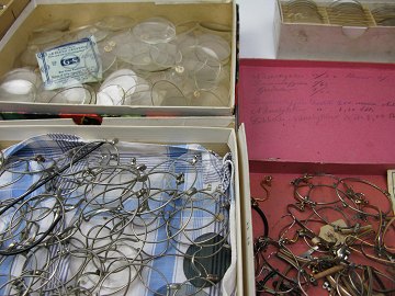 Lot med sygekassebriller, dertilhørende stel og hængsler samt brilleglas, alt sammen fra begyndelsen af det 20. århundrede. Samlingen er et oplagt emne til reklame/udstillingsbrug i en optikerforretning.
