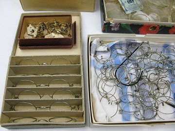 Lot med sygekassebriller, dertilhørende stel og hængsler samt brilleglas, alt sammen fra begyndelsen af det 20. århundrede. Samlingen er et oplagt emne til reklame/udstillingsbrug i en optikerforretning.