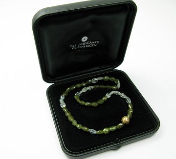 Ole Lynggaard halssmykke med gennembrudt kuglelås af 18 kt. guld, vægt 2,7 gr. Betrukket med olivenfarvede og hvide sten. L. 43 cm.