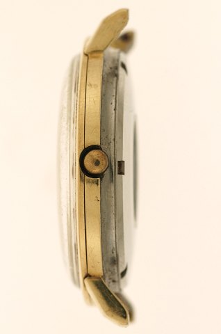 Klassisk herrearmbåndsur fra Omega, model "Constellation" fra 1970´erne, af stål m. kappe af guld, gylden, facetteret skive m. stregindeks, dotoangivelse ved 3" position, automatic urværk. Model hvor kronen næsten er skjult.