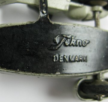 Tekno, Vespa legetøjsscooter af metal med sidevogn, nr. 443, udgave med 2 sæder. L. 6 cm. Danmark omkring 1960.