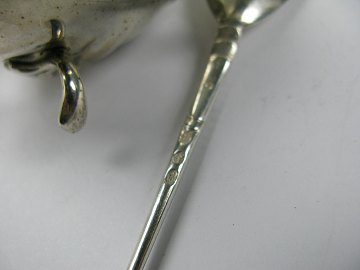 Sennepskrukke på 4 ben i form af bladværk med skævknækket korpus med glasindsats samt ske. Cohr Middelfart 1937, sennepske utydelig stemplet. H. 11,5 cm. Samlet vægt uden indsats 112 gr.