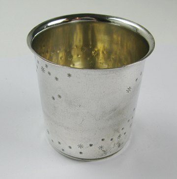 Bæger af sterling sølv med glatkorpus, dekoreret med stjerner i spiral. Stemplet Michelsen og 925 H. 7 cm., samlet vægt 94 gr.