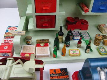 Dansk Bambola legetøjs købmandsbutik med masser af tilbehør i form af kasseapparat, vægte og danske kolonialvarer. Butik 30 x 15 x 14 cm.