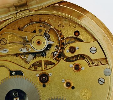 Usædvanligt velholdt herrelommeur fra IWC Schaffhausen, cal. 53 H6, i kasse af 14 kt. guld, støvkapsel ligeledes i 14 kt. guld, hvid emailleskive m. arabertal, seperat sekundviser, forgyldte visere, manuelt optræk. Ø. 48 mm.