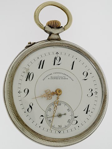Herrelommeur fra A. Lange & Söhne, Glashütte, i uoriginal kasse af sølv, hvid emailleskive m. stregindeks og arabertal, hvorpå der står: "Deutsche Uhrenfabrikation Glashütte I/S A. Lange & Söhne", seperat sekundviser, forgyldte visere, delvist forgyldt urværk, forgyldt optrækskrone. Ø. 50 mm.