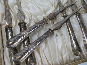 Tysk sæt med 12 hummergafler af sølvplet i Jugendstil
