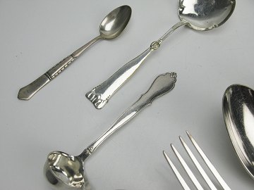 Lot bestående af 2 russiske middagsgafler, 2 middagsskeer samt théske af sølv, stemplet Boulenger og 84. Derudove medfølger flødeske, 2 kagegafler, kagespade, strøstke, marmeladeske og théske af sølvplet. 12 dele i alt.