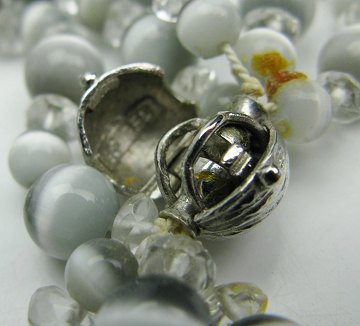 Halssmykke af 8 rader lysegrå månesten hvorimellem facetslebne glasperler, med Ole Lynggaard kuglelås af 14 kt. hvidguld. L. ca. 86 cm.