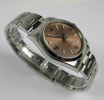 Herrearmbåndsur fra Rolex, model Air-King, i urkasse og med oysterlænke af stål, safirglas. kobberfarvet skive med arabertal ved 3#, 6# og 9# position, safirglas, automatisk urværk. Diam. 34 mm. Ref. nr. 14000