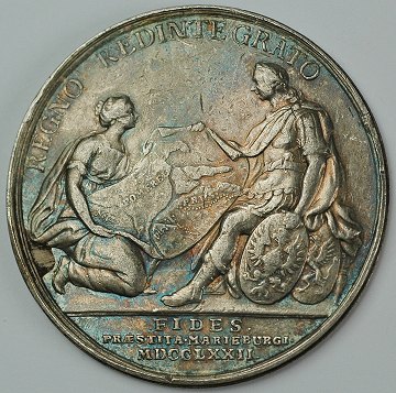 Tysk medaille af sølv, præget under Friedrich II den Store, 1740-1786, til hyldest af Marienburg i anledning af den første polske deling. På fs. står: FRIDERICUS BORUSSORUM REX over sidevendt, lauerbærprydet busteportræt af Friedrich II, og på bs.: REGNO REDINTE GRATO over siddende konge, der støtter armen på våbenskjold m. Preussen og Pommerns mærke, herunder FIDES. / PRAESTITA. MARIEBURGI / MDCCLXXII. Ø. 51,5 mm.