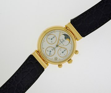 Damearmbåndsur fra IWC Schaffhausen, model Da Vinci, i kasse af 18 kt. guld, hvid emailleskive m. stregindeks, chronograffunktion, månefase- og datoangivelse ved 4.30" position, monteret m. sort læderrem, originalt IWC-spænde i 18 kt. guld, quartz-urværk. Ø. 29 mm.