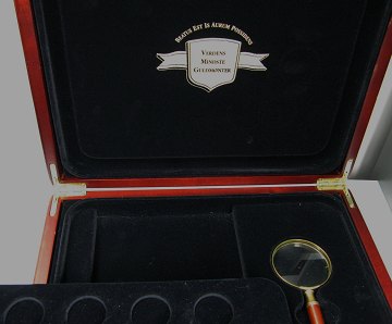 Lot bestående af skuffekassette med 2 indsatse til mønter på op til 50 mm. samt kassette fra "Verdens mindste guldmønter" inkl. lup. Kassetterne måler 29 x 25 cm.