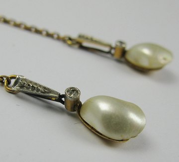 Par ørestikker af 14 kt. guld, prydet med vedhæng på sirlig ankerkæde, hver prydet med ½ ferskvandsperle i muslingfatning af guld og brillantsleben diamant på ca. 0,05 kt. L. med kæde ca. 40 mm.