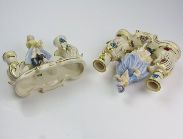 Et par lysestager af porcelain, i rokokko-stil m. herre og dame i fornemme gevanter, bemalet og delvist forgylt, dekoreret m. blomster. H. 17 cm.