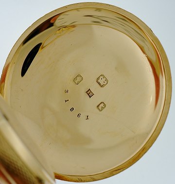 Tungt herrelommeur i kasse af 18 kt. guld, hvid emailleskive m. romertal, seperat sekundviser, sorte visere, begge kapsler dekoreret m. cartouch, den ene m. dampskib, urværk m. cylindergang. Ø. 55 mm.