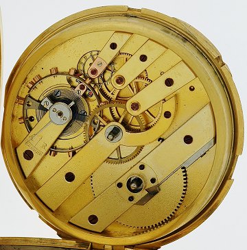 Tungt herrelommeur i kasse af 18 kt. guld, hvid emailleskive m. romertal, seperat sekundviser, sorte visere, begge kapsler dekoreret m. cartouch, den ene m. dampskib, urværk m. cylindergang. Ø. 55 mm.