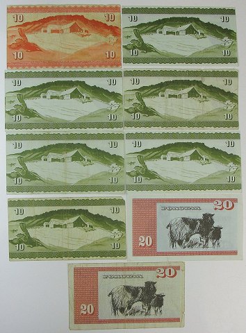 Samnling færøeske sedler, bestående af: 10 kr (7) 1954-1978 samt 20 kr 1986 (2).