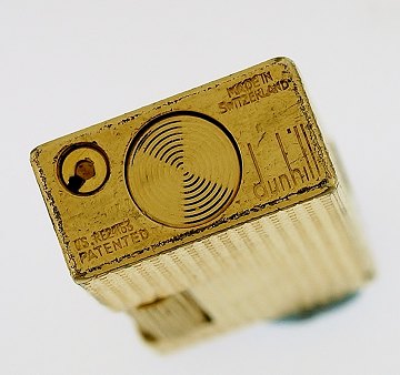 Lighter fra Dunhill af forgyldt metal m. riflet mønster m. indlagt lapis lazuli. L. 65 mm.