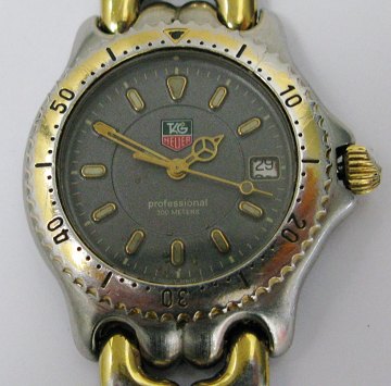 Tag Heuer mid-size armbåndsur i kasse af stål/gulddoublé, model WG1220-KO. Koksgrå skive med stregindikation, central sekundviser og datovisning i # positionen. Urkasse Diam. ca. 34 mm. Lænke og krone defekt.