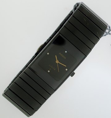 Herrearmbåndsur fra Rado, model Diastar Jubilé, ref.nr.: 9521, i kasse og m. lænke af sort keramik og stål, sort skive prydet m. 4 brillantslebne diamanter, datoangivelse ved 6" position, safirglas, quartz urværk. Ø. 24 x 30 mm.