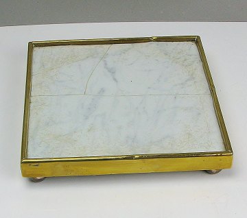 Klassicistisk thesæt i messing, bestående af: kande m. svulmende korpus, bøjet pibe samt hank af lakeret træ, ovalt fyrfad m. gennembrudt korpus, inderbækken i støbejern og buet stjært samt fodplade (eller stand) m. marmor. H. 29 cm.