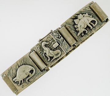 Veludført armlænke af sølv, udformet m. motiver af forhistoriske dyr i relief, stemplet "S-S 830S HAANDARBEJDE". L. 19,5 cm.
