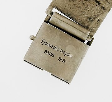 Veludført armlænke af sølv, udformet m. motiver af forhistoriske dyr i relief, stemplet "S-S 830S HAANDARBEJDE". L. 19,5 cm.