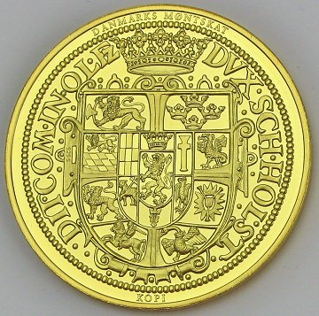 Medaille af sterlingsølv forgyldt m. 24 kt. guld, præget m. forlæg i Christian IV´s portugaløser fra 1591. Ø. 38,6 mm.