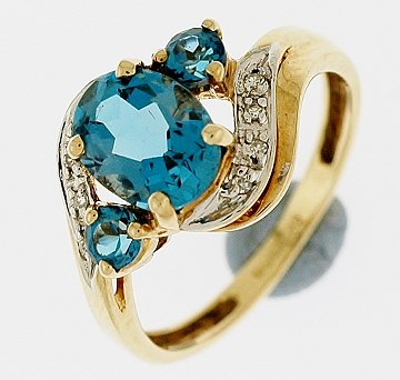 Ring af 9 kt. delvist rhodineret guld, prydet m. facetslebne blå topaser samt brillantslebne diamanter, str. 49 1/2.