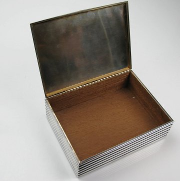 Cigarkasse af sølvplet med harlequin mønster og riflede dekorationer. Indvendig beklædt med cigarkassetræ. 19 x 14 x 5,5 cm. Stemplet H.F. 20. årh.