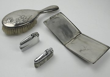 Lot bestående af rosendekoreret hårbørste, cigaretetui samt Ronson Variflame og Prince Micro lighter. Sidstnævnte beklædt med perlemorsegmenter med små hjørneafslag.