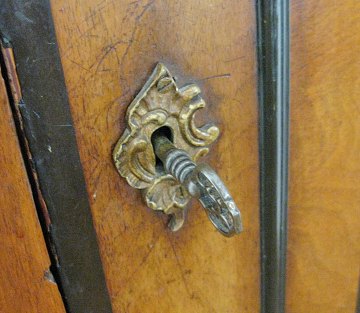 Sølvtøj- og dækketøjsskab af mahognyfinér med sorte konturer. Forneden og foroven enkelt skuffe, indrettet med ophængshylde for sølvskeer samt 2 dækketøjshylder. 152 x 72 x 38 cm.