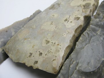 Tre oldtids flinteredskaber i form af kerneøkse, økse og skraber. L. henholdsvis 16, 11 og 10 cm.
