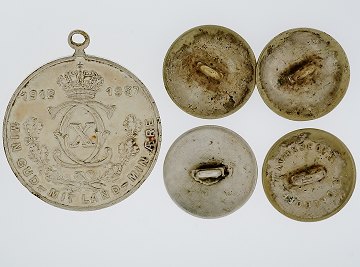 Jubilæumsmedaille af metal, præget i anledning af 25 års regentjubilæum 1912-1937, Ø. 31,5 mm. samt 4 stk. ældre knapper m. rester af forsølvning, prydet m. våbenskjold, Ø. 19 mm.