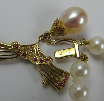 Dobbeltradet perlecollier med 6 mm. kulturperler og lås i form af sløjfeformet vedhæng, prydet med Burma perle og rubinfarvede sten. L. 46 cm.