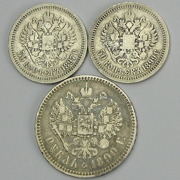 Rusland, Nikolai II, 50 kopek(2) og rubel SØLV 1897,-99 - Y# 58.2, 59.3