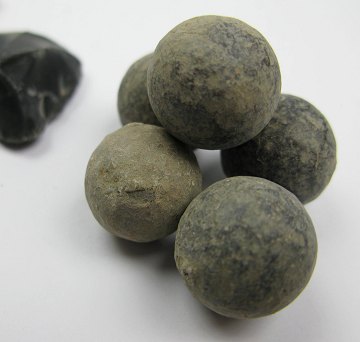 Lot med 10 tændlås flintesten og 5 blykugler til Brown Bess flintepistol fra Napoleonskrigene 1760 - 1820. Fundet på slagmarker i Europa.
