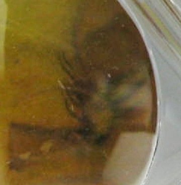 3 ravklumper med insekter, monteret i plexiglas showcase med forstærrelsesglas. Hver klump ca. L. 20 mm.