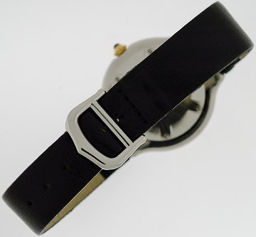 Damearmbåndsur fra Cartier, model Must de Cartier 21, ref.nr.: 1330, i kasse af delvist forgyldt stål, sølvfarvet skive, forgyldt inderkrans m. arabertal, lynette m. romertal, krone prydet m. carbochonsleben safir, monteret m. nyere sort læderrem, originalt Cartier-spænde af stål, mineral glas, quartz urværk. Ø. 31 mm.