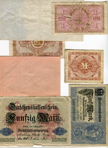 Lot sedler fra inflationstiden plus 1 mark serie 1948 samt 5 mark og 10 mark serie 1944 "Allierte Militärbehörde". 11 sedler i alt.