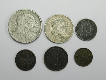 Polen, lot med 10 zlotych 1932, 5 zlotych 1933, samlet sølvægt 32,4 gr. samt 20 fenigow 1918, 10 fenigow 1917, 5 groshzy 1923 og 2 groshzy 1923. 6 mønter i alt.