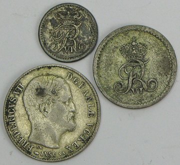 Lot bedre skillingsmønter, bestående af: 2 rigsbankskilling 1836, 3 rigsbankskilling 1819 samt 16 skilling 1856 VS.