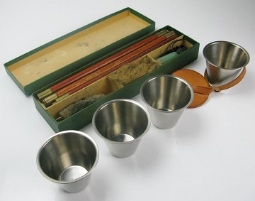 Jaguar gevær pudsesæt med stok og riffelbørste og polerbørster samt flaske til geværolje og 4 drikkebægre af stål med læderlåg og remlukke.