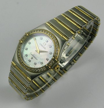 Omega Constellation damearmbåndsur i kasse og med lænke af guld/stål. Perlemor skive med indikationer i form af 12 diamanter, omkranset af yderlige 38 diamanter på samlet 0,46 ct. Top Wesselton VVS - cut 32/24. Quartsværk. Urkasse Diam. 25 mm., ref. nr. 12777500 - Certifikat og manualer medfølger.
