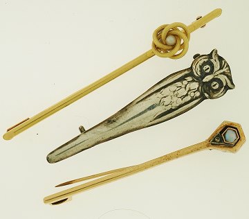 Lot ældre bijouteri, bestående af: 6 brocher af bl.a. forsølvet og forgyldt metal, prydet m. diverse stene, 2 nåle m. bl.a. Dannebrog i emaille samt en broche af sølv udformet m. ugle-hoved og 2 brocher af guld, den ene af 18 kt. guld prydet m. perle, den anden i 8 kt. guld m. indlagt perlemor og mindre sten.