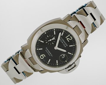 Herrearmbåndsur fra Panerai, model Marina, ref.nr.: PAM00165, i kasse og m. lænke af henholdsvis poleret og mat stål, sort skive m. arabertal og selvlysende stregindeks, datoangivelse ved 3" position, seperat sekundviser, krone m. patenteret Panerai-bøjle, safirglas, håndoptræk. Ø. 44 mm.